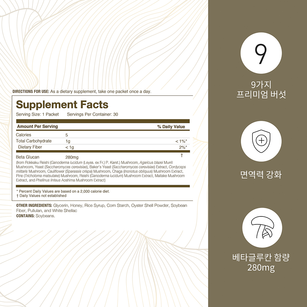 일반적인 베타글루칸은 효모, 곡물 또는 몇 가지 버섯 추출물로 만들어지는 반면, 우메켄 베타글루칸은 9가지 최고급 버섯 추출물을 사용하여 우수하고 강력한 효과를 얻을 수 있습니다.