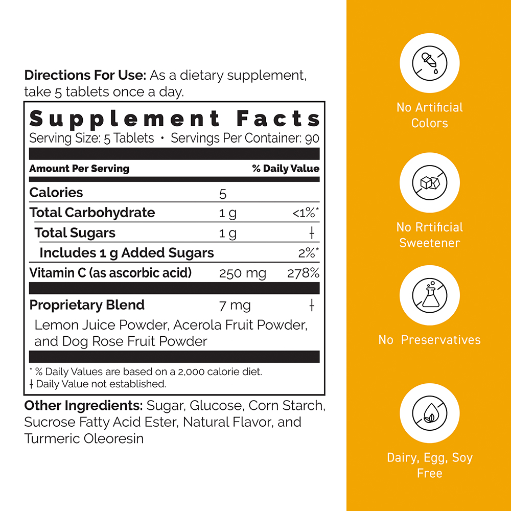 A chewable and delicious vitamin C supplement for the whole family. Taking 5 C-Balance tablets is equal to consuming the vitamin C of 8 lemons. No artificial color, sweetener, or preservative.