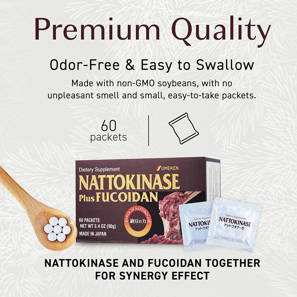 Umeken’s Nattokinase contains the recommended daily dosage of 2500FU (fibrin units) of nattokinase. It uses non-GMO soybeans and fucoidan from Okinawa mozuku, plus gingko and soybean lecithin to boost efficacy.