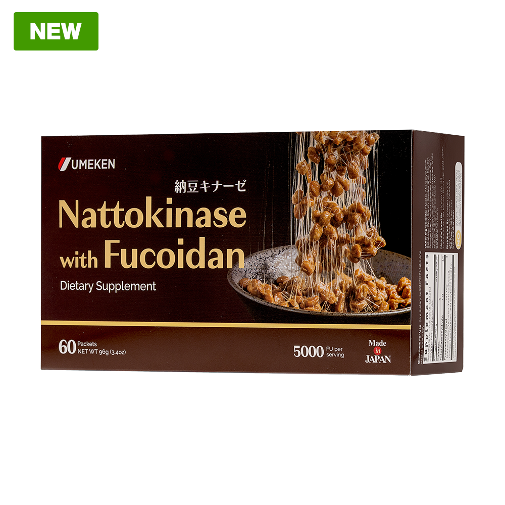 Umeken’s Nattokinase contains the recommended daily dosage of 5000FU (fibrin units) of nattokinase. It uses non-GMO soybeans and fucoidan from Okinawa mozuku, plus gingko and soybean lecithin to boost efficacy.