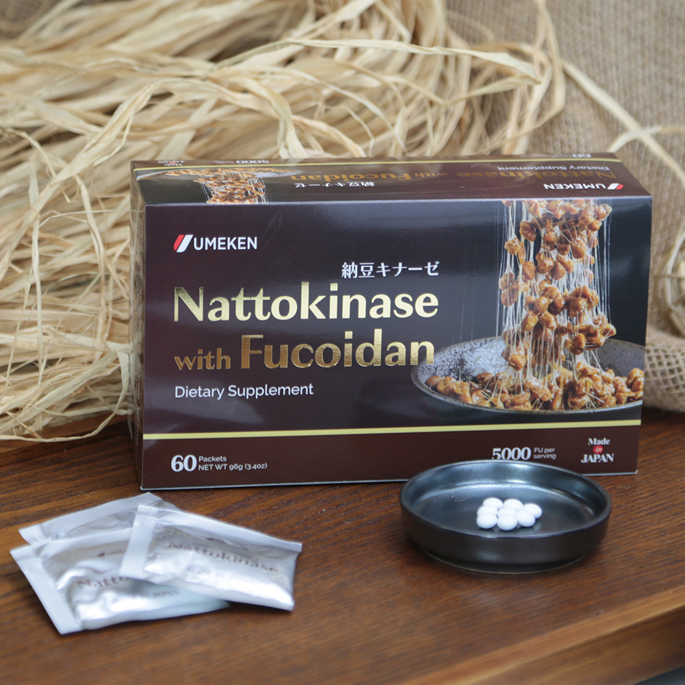 Umeken’s Nattokinase contains the recommended daily dosage of 5000FU (fibrin units) of nattokinase. It uses non-GMO soybeans and fucoidan from Okinawa mozuku, plus gingko and soybean lecithin to boost efficacy.