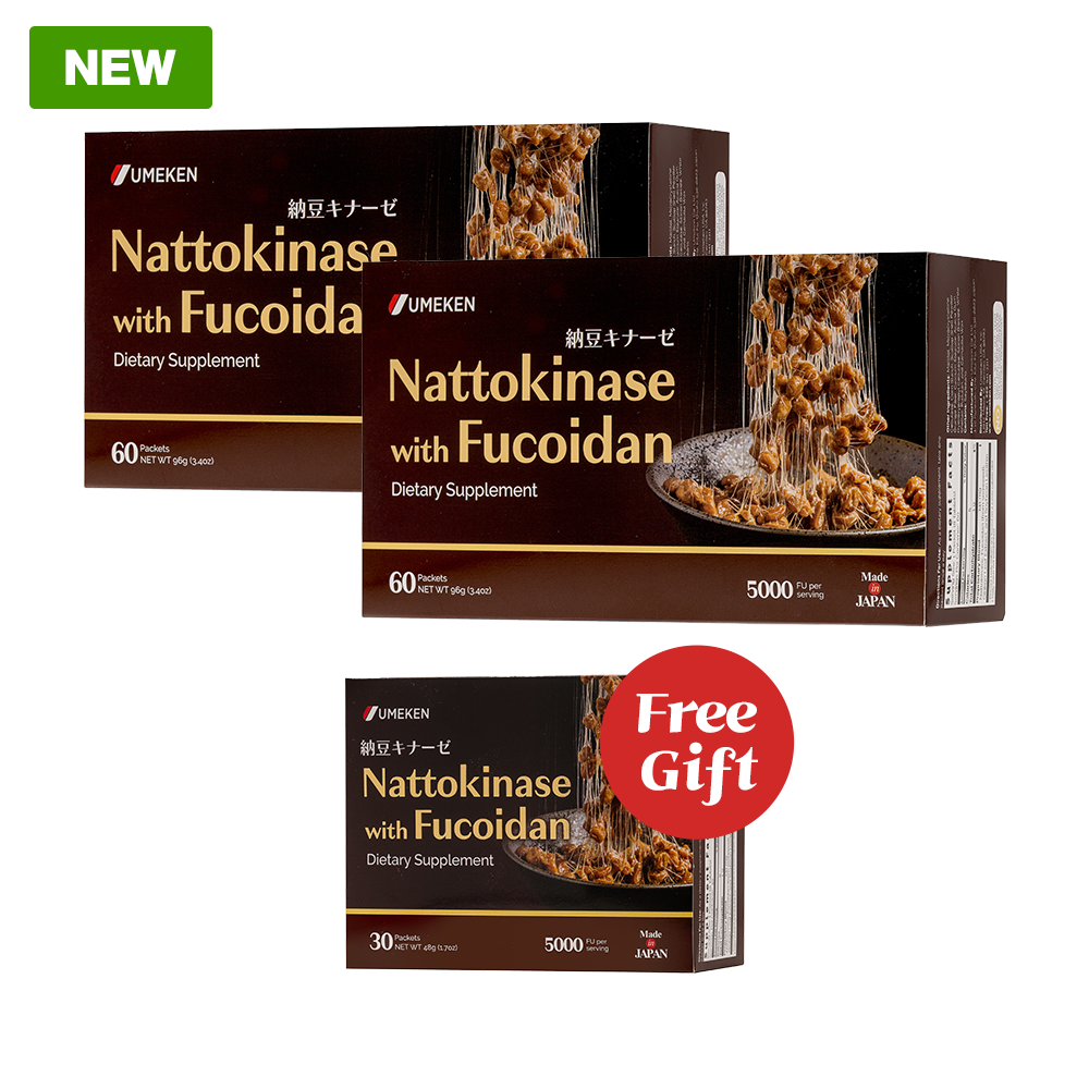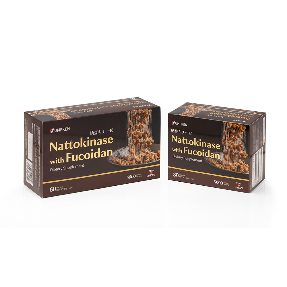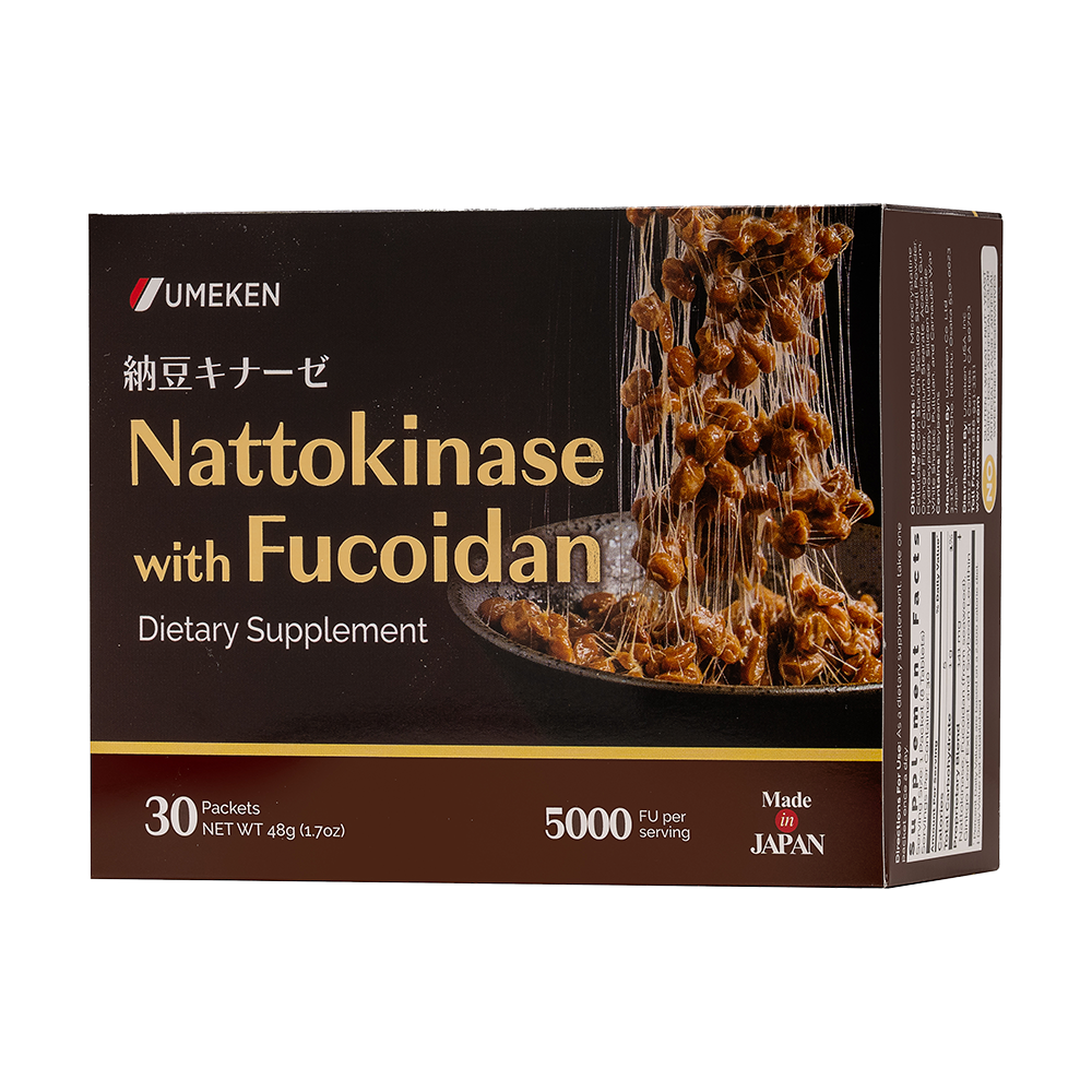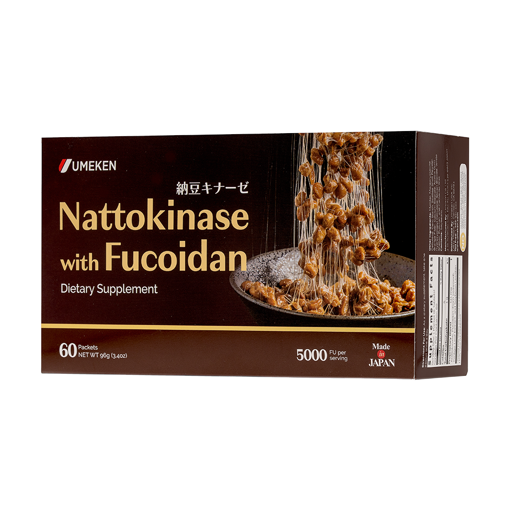 Umeken’s Nattokinase contains the recommended daily dosage of 5000FU (fibrin units) of nattokinase. It uses non-GMO soybeans and fucoidan from Okinawa mozuku, plus gingko and soybean lecithin to boost efficacy.