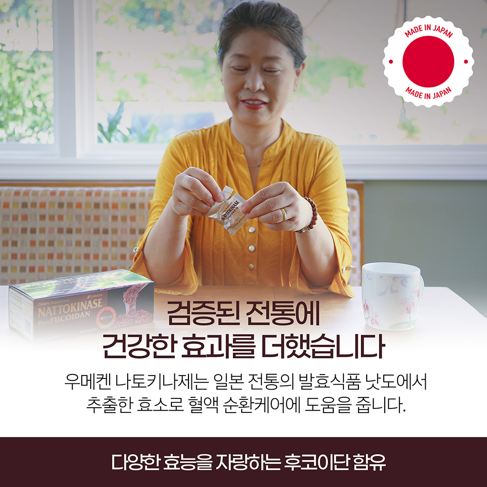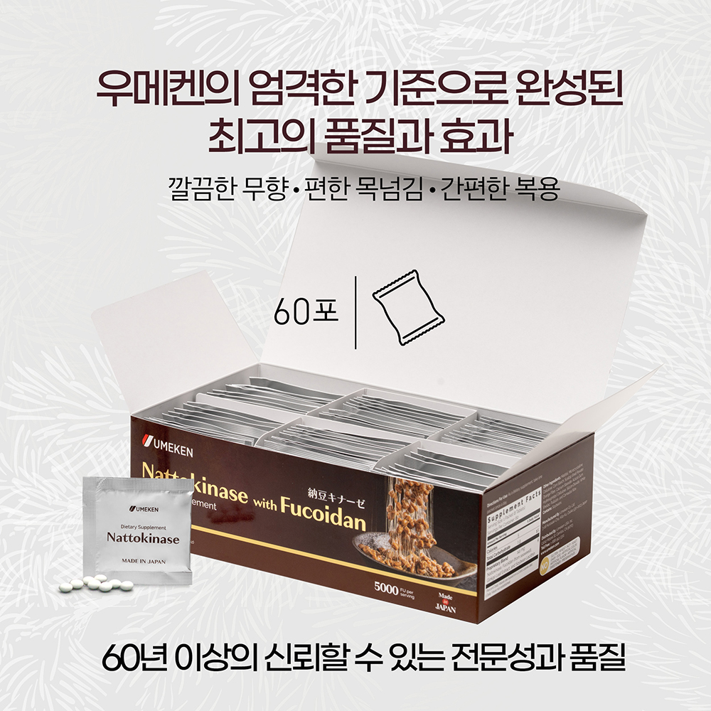 우메켄의 나토키나제는 나토키나제 일일 권장량 5000FU (단위: 피브린)을 함유하고 있습니다. 오키나와 모즈쿠산의 non-GMO 대두와 후코이단과 함께 은행과 대두 레시틴을 사용하여 효능을 높였습니다.