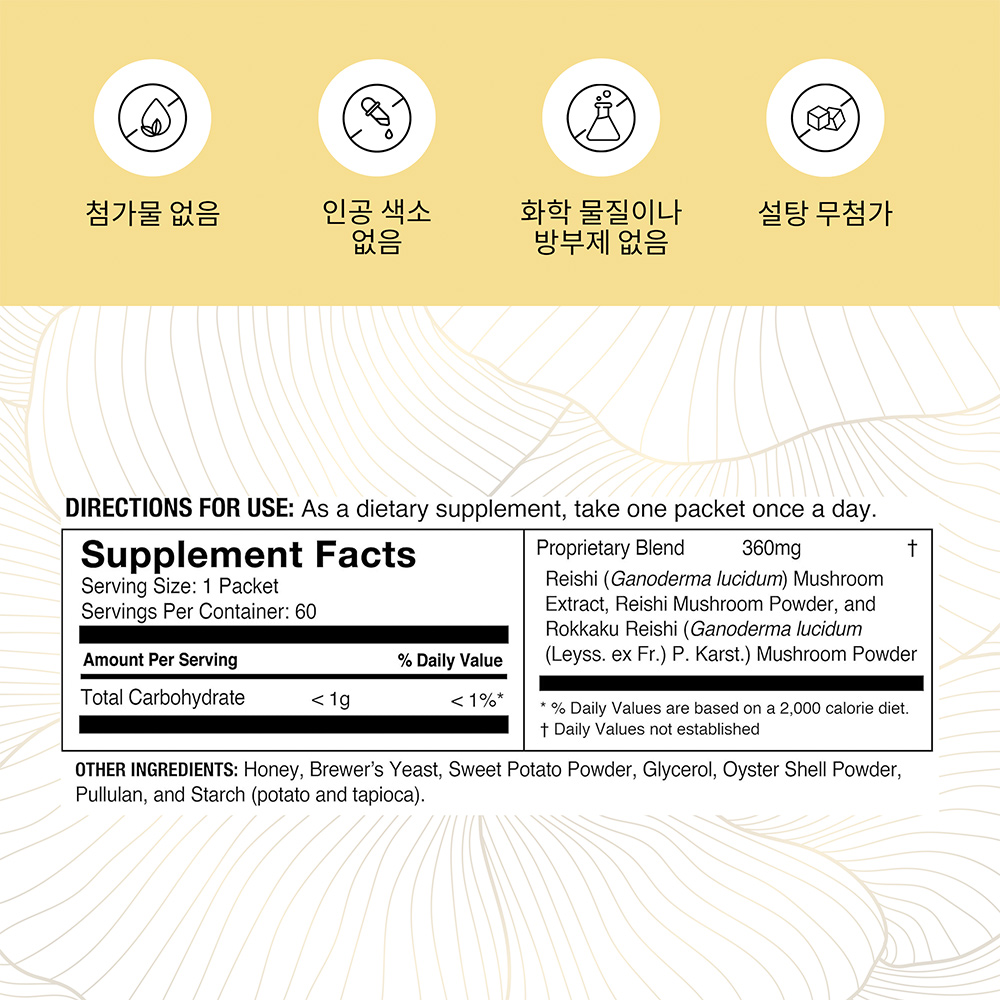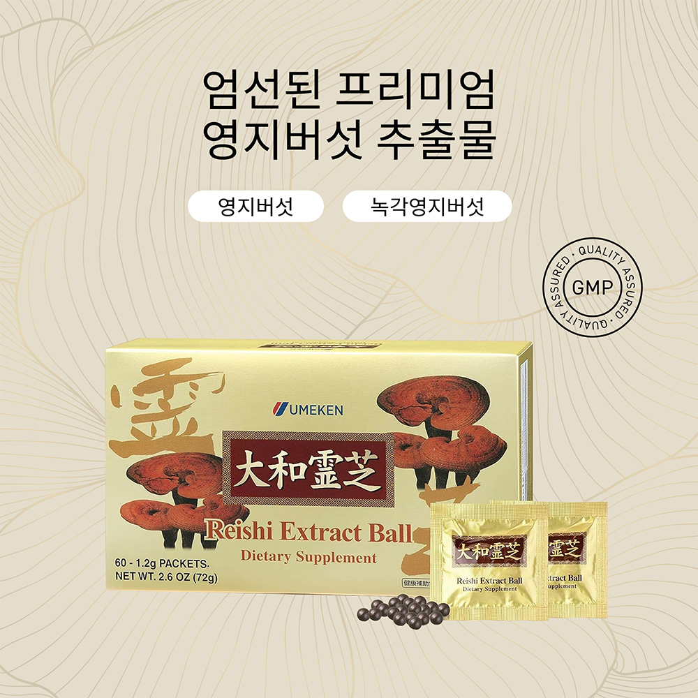 영지: 우메켄에서 사용하는 영지버섯은 나라현과 군마현에서 수집한 천연 곰팡이 균주에서 재배되며, 재배과정은 활성 성분을 풍부하게 해주는 천연 나무 환경에서 이루어집니다. 당사의 영지버섯 진균은 계대배양을 하지 않기 때문에 균주의 돌연변이 없이 품질과 효능이 유지됩니다.